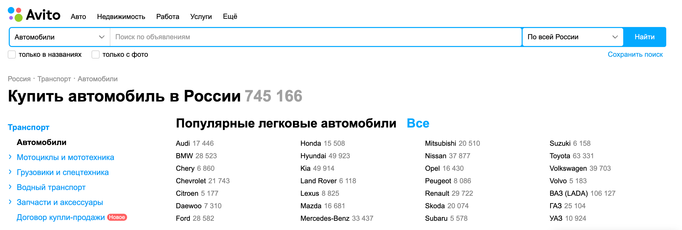 Авито. Включает специальный раздел по продаже авто с пробегом. Поиск здесь также очень функционален — можно сужать параметры не только до конкретного города, но и района проживания (крайне удобно для жителей больших городов). Среди недостатков — есть ограничения по количеству бесплатных объявлений, приходится платить деньги.