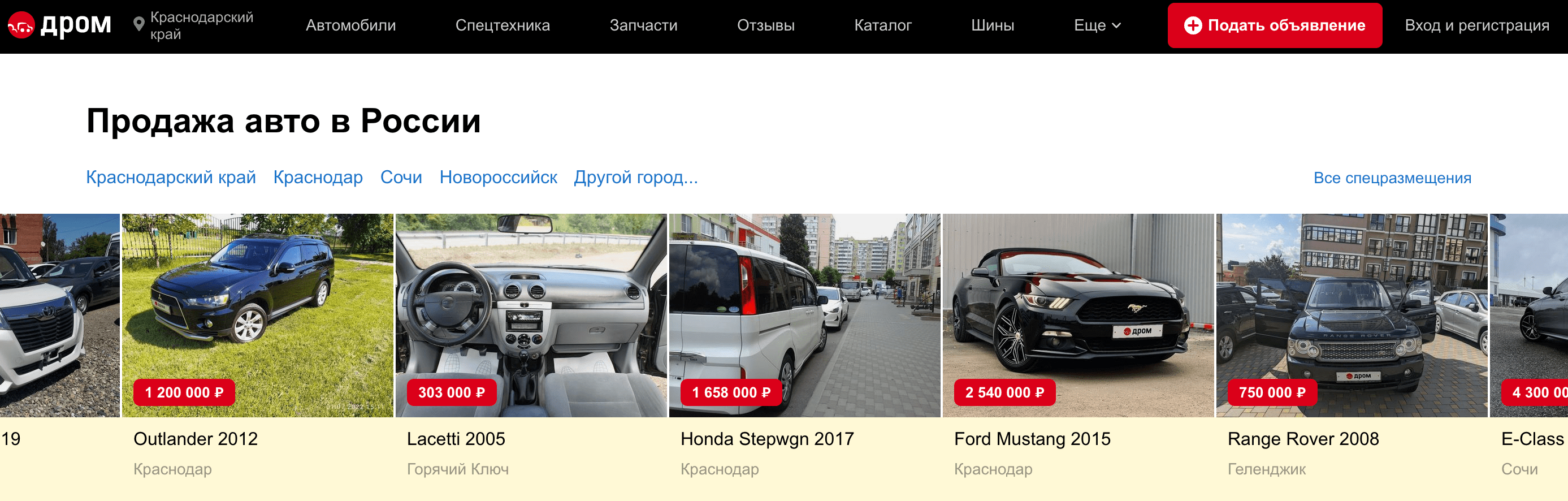 Дром. Главный плюс — удобный встроенный поиск, позволяющий выставить машину по конкретному региону, городу, марке и модели.