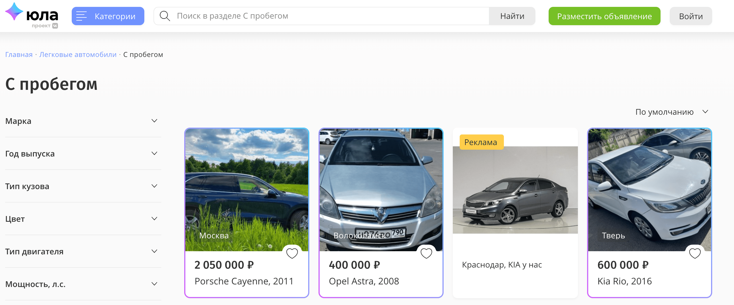Юла. Сравнительно молодая площадка, являющаяся прямым конкурентом Авито. Рекламные объявления тут более содержательны — включают много параметров, таких как госпошлина, транспортный налог, расход горючего.